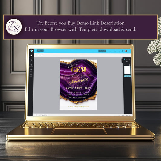 Amethyst Gemstone Birthday Invitation | Purple & Gold 5x7 Editable Template | Elegant Digital Download