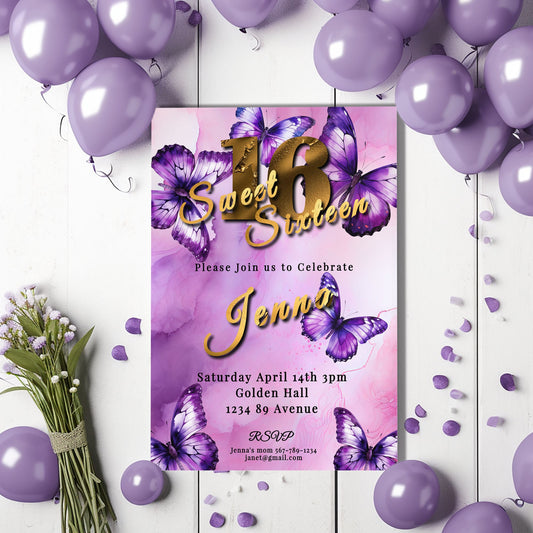 Butterfly Invitation Sweet 16 5x7in -Birthday Butterfly-Spring Purple Butterfly invite, Editable, Printable-Customizable