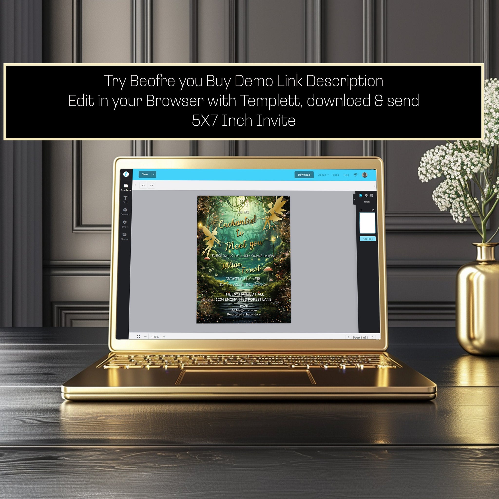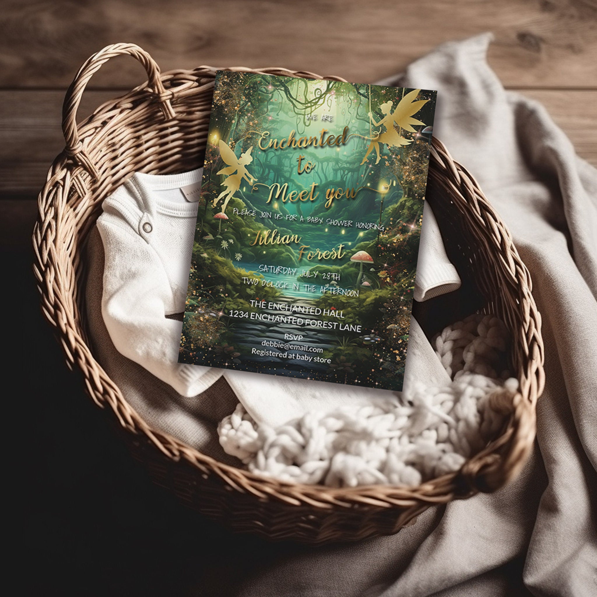 Make your Baby Shower Magical with this Enchanted Forest Invite Template. Our fully editable design features a magical forest background and Golden foil lettering, creating a stylish and memorable Invite for your event. You'll receive an 5X7in invite template that is fully editable in your browser and then download and send digitally or Print off at home or send to a printer. Check out the Demo of this template by copying and pasting the following link into your browser http://templett.com/design/demo/creativedigitally/28576125 With unlimited edits and downloads, you can customize every detail to suit your preferences. Choose to send digitally or print at home or through a professional printer. We also offer excellent customer support to assist you throughout the process. Product Details: Enchanted Forest Theme Design 5x7In Unlimited Edits and Downloads Customer Support Available Order now and create the perfect Invite for your Enchanted celebration! Looking for more Enchanting Designs check out the link below! https://www.etsy.com/ca/shop/CreativeDigitally?ref=seller-platform-mcnav&section_id=45442888 Effortless Customization with Templett: Our invitation template is designed for convenience. With Templett, you can effortlessly personalize the invitation to suit your preferences. No need for advanced design skills or software – it's as easy as a few clicks! Unlimited Edits, No Time Constraints: Enjoy complete creative freedom! There's no rush or pressure to finalize your design. Feel free to make edits at your own pace, ensuring every detail is just right for your special day. All invite template designs presented here are original creations, crafted with attention to detail and creativity. Some images used in the templates may have been generated with the assistance of AI technology. Any resemblance to other designs is purely coincidental. These templates are intended for personal use only and should not be redistributed or sold without permission. Please respect the effort and creativity involved in making these designs. [id:28576125]