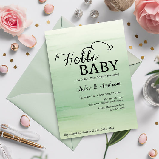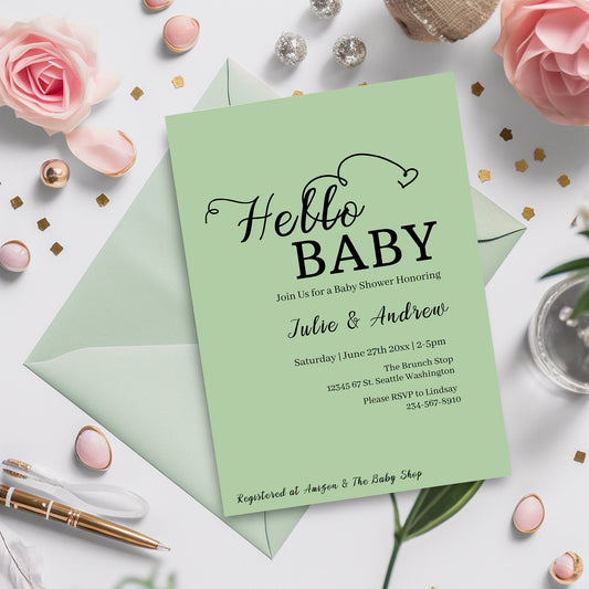 Sage Green Baby Shower Invitation - Modern 5x7 Editable Template, Minimalist Card