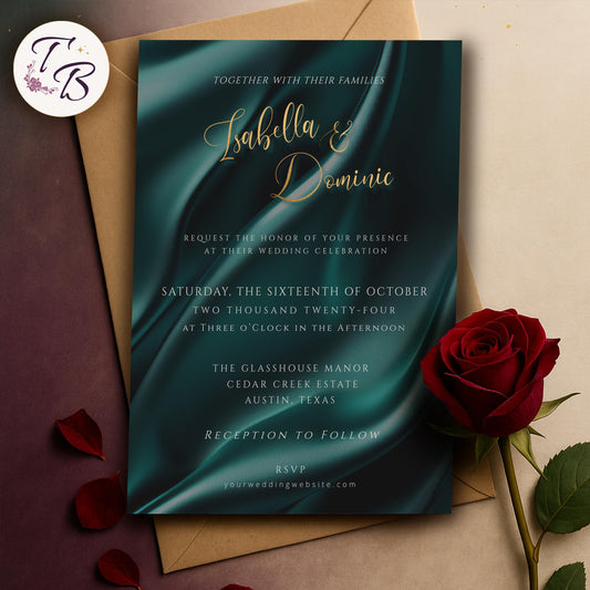 Teal Gold Wedding Invitation – Editable Luxury Invite With Satin Background & Gold Lettering