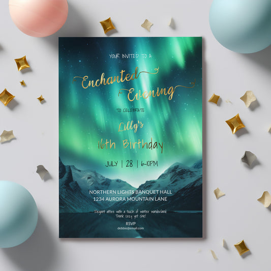 Northern Lights Sweet 16 Invitation – Aurora Borealis Editable Template