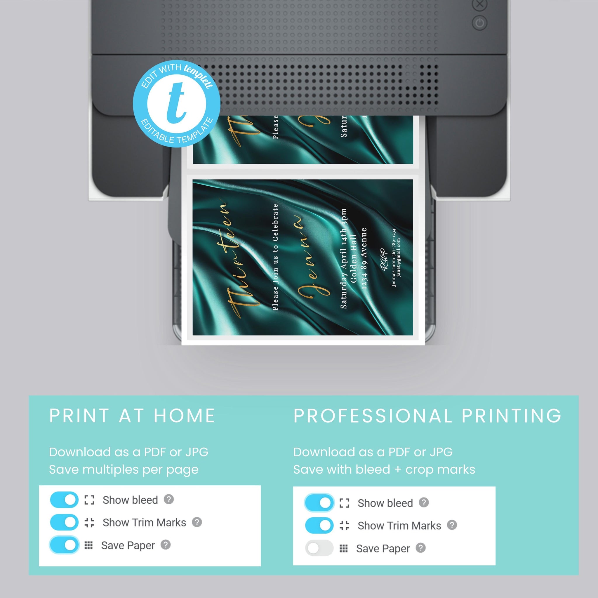 Delight in the convenience and elegance of our Teal & Gold Foil 5x7 Invitation Template for your teen's 13th birthday celebration. This digital download allows you to personally edit and print stunning invitations right from your home or through your preferred printer. DEMO--- Just copy and paste the following full link into your browser and you will be taken to the demo area! http://templett.com/design/demo/creativedigitally/29254746 The design features a luxurious Teal foil background with sophisticated Gold foil effect lettering, creating an invitation that is both stylish and memorable. It's perfect for those who love a DIY approach without compromising on professional quality. Our template is fully editable, allowing you to add your personal touch to every detail. Utilize our 'Try Before You Buy' demo to experiment with the design. We provide comprehensive instructional videos and are ready to offer customer support for any editing inquiries. Choose this template for a hands-on approach to creating beautiful, personalized invitations for a memorable teenage celebration! Effortless Customization with Templett: Our invitation template is designed for convenience. With Templett, you can effortlessly personalize the invitation to suit your preferences. No need for advanced design skills or software – it's as easy as a few clicks! Unlimited Edits, No Time Constraints: Enjoy complete creative freedom! There's no rush or pressure to finalize your design. Feel free to make edits at your own pace, ensuring every detail is just right for your special day. [id:29254746]