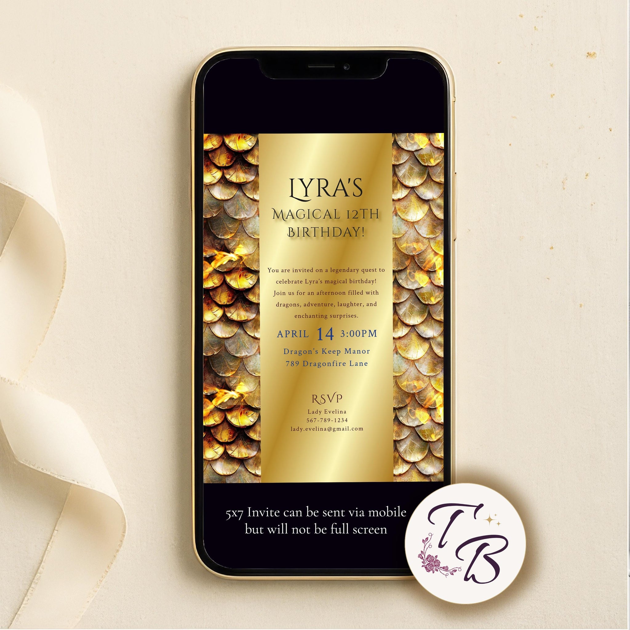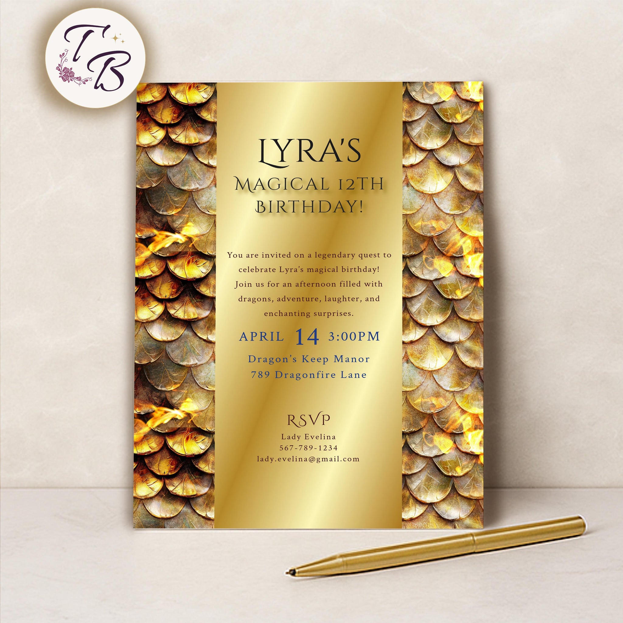 Dragon Birthday Invitation - Editable Party Template With Golden Scales & Medieval Design