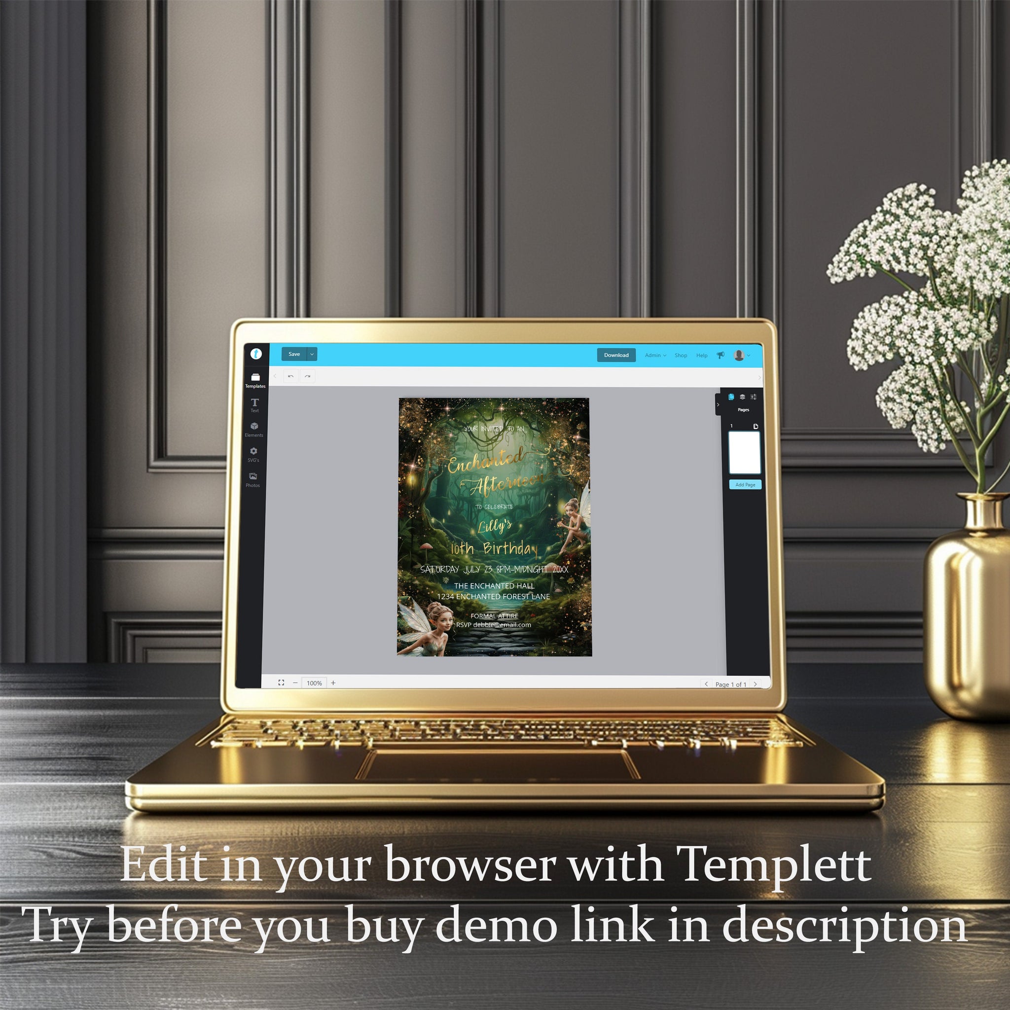 Make your Birthday Party Extra Special with this Enchanted Forest Invite Template. Our fully editable design features a magical forest background, fairies and Golden foil lettering, creating a stylish and memorable Invite for your event. You'll receive an 5X7in invite template that is fully editable in your browser and then download and send digitally or Print off at home or send to a printer. Check out the Demo of this template by copying and pasting the following link into your browser http://templett.com/design/demo/creativedigitally/28576043 With unlimited edits and downloads, you can customize every detail to suit your preferences. Choose to send digitally or print at home or through a professional printer. We also offer excellent customer support to assist you throughout the process. Product Details: Enchanted Forest Theme Design 5x7In Unlimited Edits and Downloads Customer Support Available Order now and create the perfect Invite for your Enchanted celebration! Looking for more enchanted designs? Check out the link below https://www.etsy.com/ca/shop/CreativeDigitally?ref=seller-platform-mcnav&section_id=45442888 Effortless Customization with Templett: Our invitation template is designed for convenience. With Templett, you can effortlessly personalize the invitation to suit your preferences. No need for advanced design skills or software – it's as easy as a few clicks! Unlimited Edits, No Time Constraints: Enjoy complete creative freedom! There's no rush or pressure to finalize your design. Feel free to make edits at your own pace, ensuring every detail is just right for your special day. All invite template designs presented here are original creations, crafted with attention to detail and creativity. Some images used in the templates may have been generated with the assistance of AI technology. Any resemblance to other designs is purely coincidental. These templates are intended for personal use only and should not be redistributed or sold without permission. Please respect the effort and creativity involved in making these designs. [id:28576043]