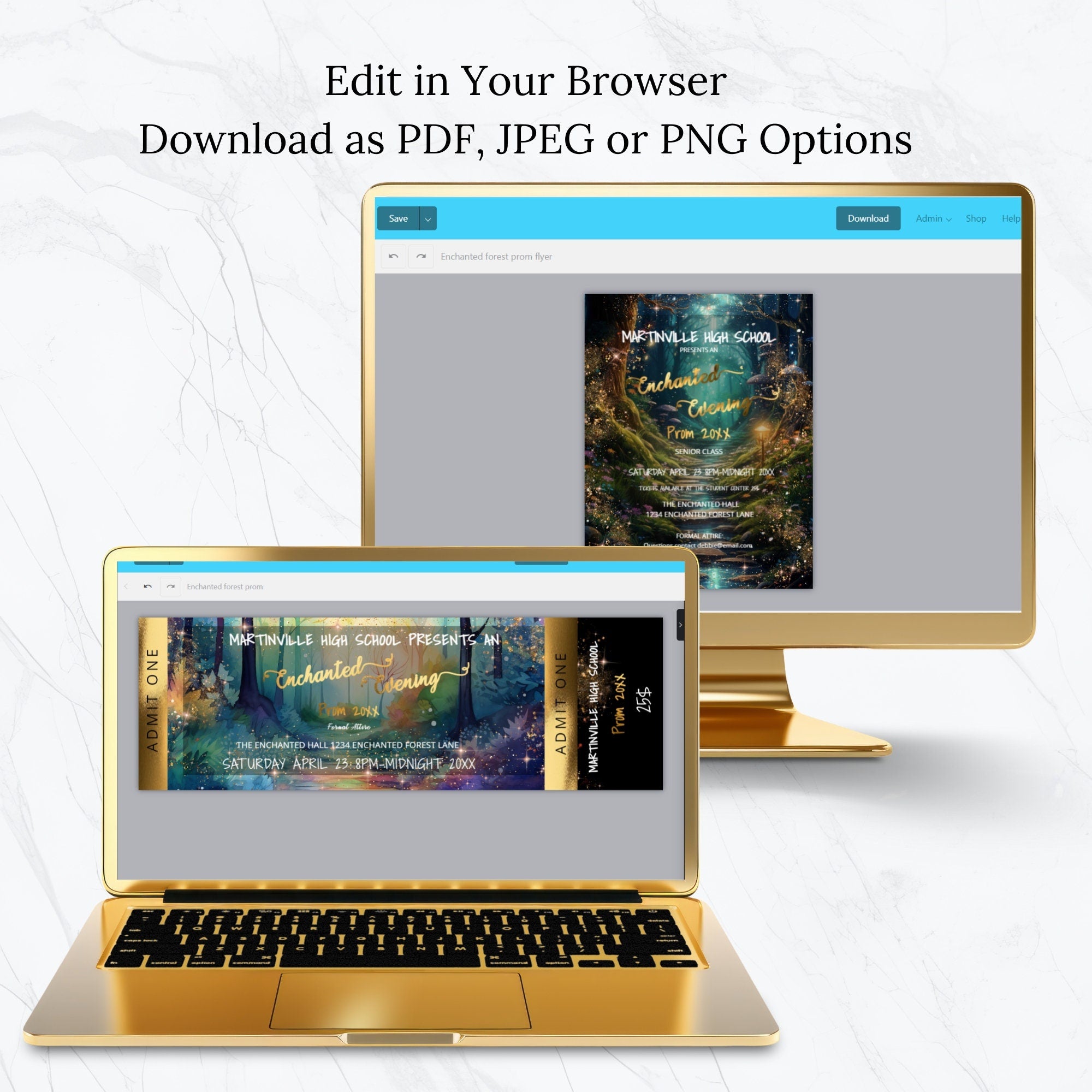 Make your Senior Prom unforgettable with this Enchanted Forest Event Bundle. Featuring a magical woodland background with shimmering gold foil-style lettering, this coordinated set includes editable templates for your invitation, flyer, and ticket — everything you need to create a stylish and memorable prom theme.
