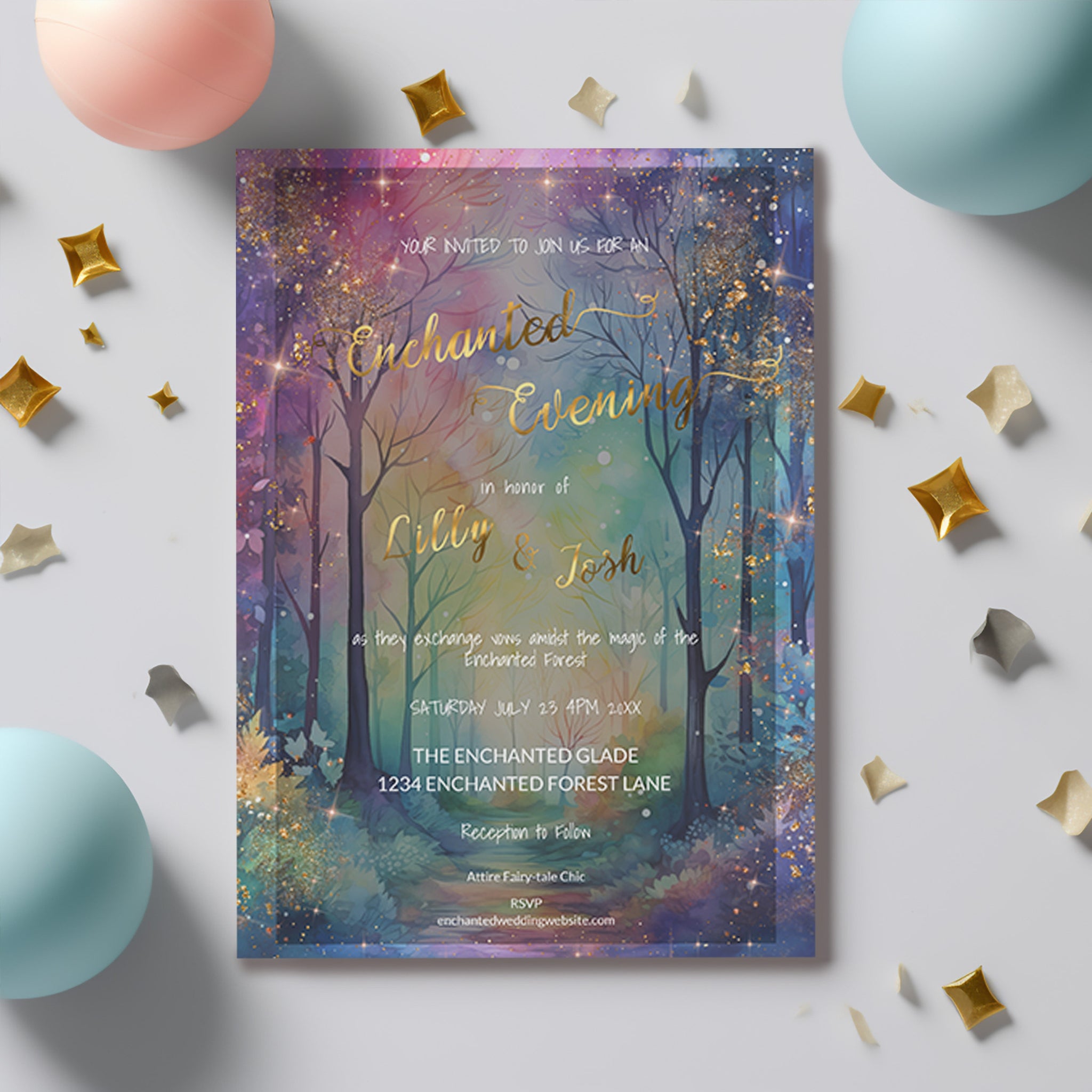 Create a magical celebration with the enchanted forest wedding invitation suite, designed to bring a fairytale charm to your special day. This editable wedding invitation template bundle offers a luxury wedding invitation bundle experience that combines elegant woodland themes with budget-friendly wedding stationery, perfect for couples seeking a stunning yet affordable option. Featuring a dreamy forest backdrop and shimmering gold foil wedding invite style lettering, this set transforms your invitations into a memorable keepsake that guests will cherish.
