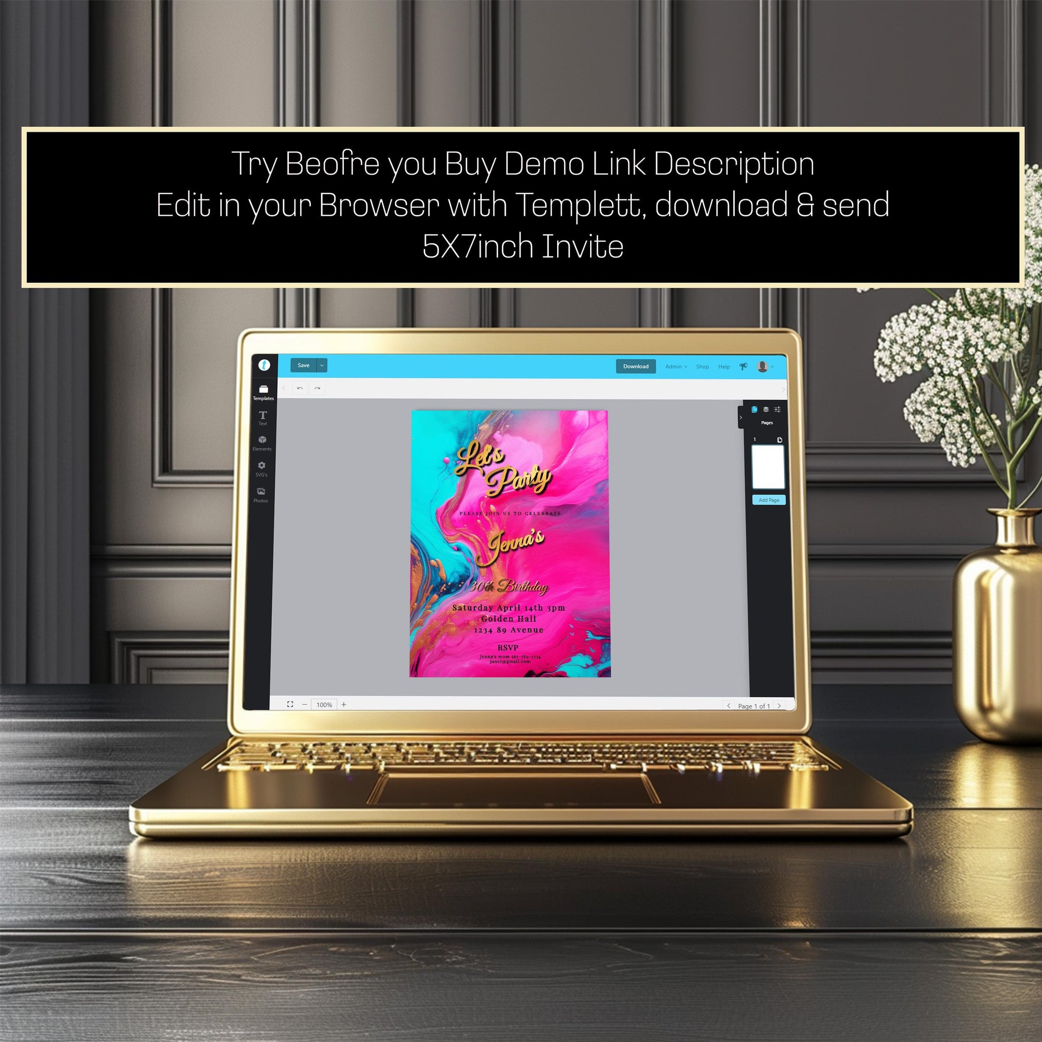 Celebrate in style with our Editable Printable Hot Pink, Teal and Gold Birthday invitation, featuring a stunning gold foil lettering effect. Perfectly sized at 5x7 inches, these invites bring a touch of elegance to your celebration. Try Before You Buy: Test the design with our demo link before purchase. Copy and paste the following link into your browser. http://templett.com/design/demo/creativedigitally/33302902 Features: Editable Design: Customize the invite with your details using our easy-to-use Templett browser editor. Elegant Aesthetics: The gold foil lettering and unique background ensure your invite stands out. Printable Format: Receive a high-quality 5x7 inch template that can be downloaded in JPG, PNG or PDF format for easy printing at home or at a professional print shop. Comprehensive Support: Includes instructional videos for easy editing and personal customer support as needed. Benefits: Convenient & Customizable: Edit from your browser and print as many as you need. Memorable Design: Make a lasting impression with a beautifully designed invite. Eco-Friendly Option: Print only what you need, reducing waste. Perfect for anyone looking to add a personal and elegant touch to their celebration. Effortless Customization with Templett: Our invitation template is designed for convenience. With Templett, you can effortlessly personalize the invitation to suit your preferences. No need for advanced design skills or software – it's as easy as a few clicks! Unlimited Edits, No Time Constraints: Enjoy complete creative freedom! There's no rush or pressure to finalize your design. Feel free to make edits at your own pace, ensuring every detail is just right for your special day. [id:33302902]
