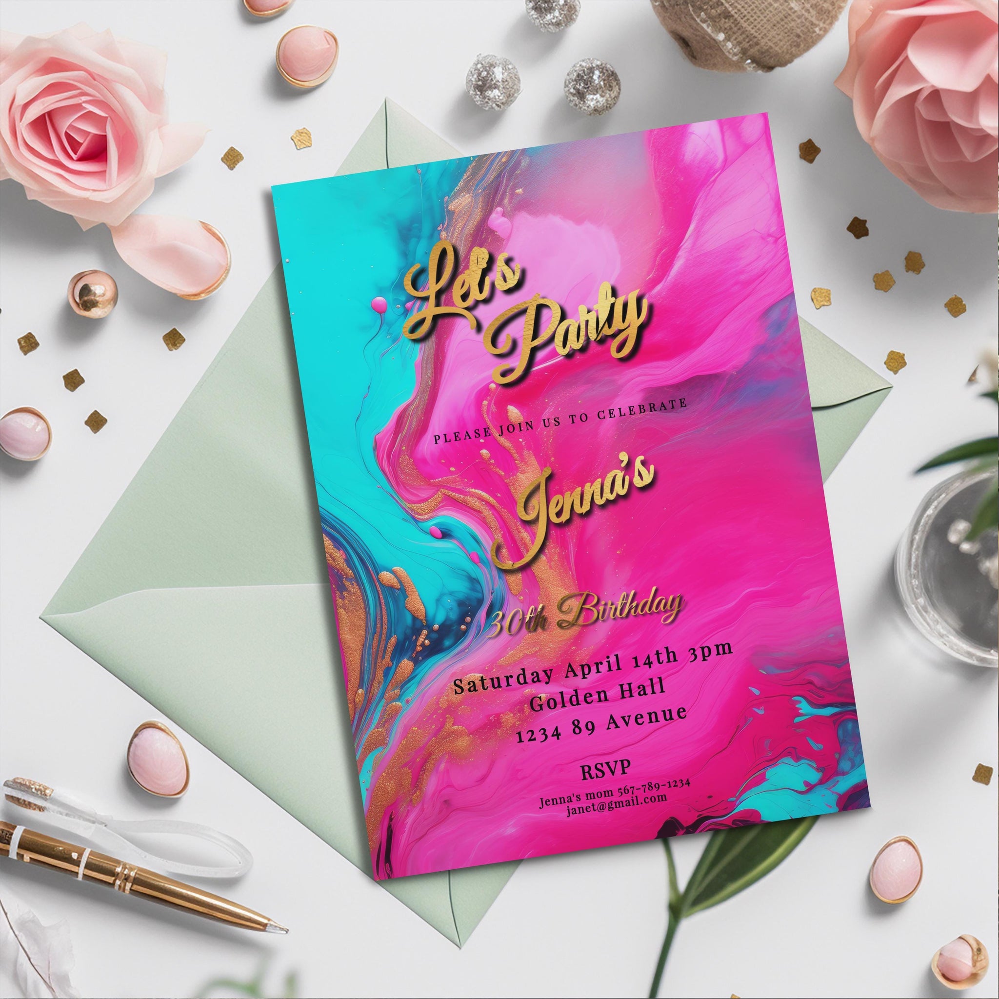 Hot Pink, Teal & Gold Birthday Editable Invitation 5x7in -brunch invite-Editable, Printable - style
