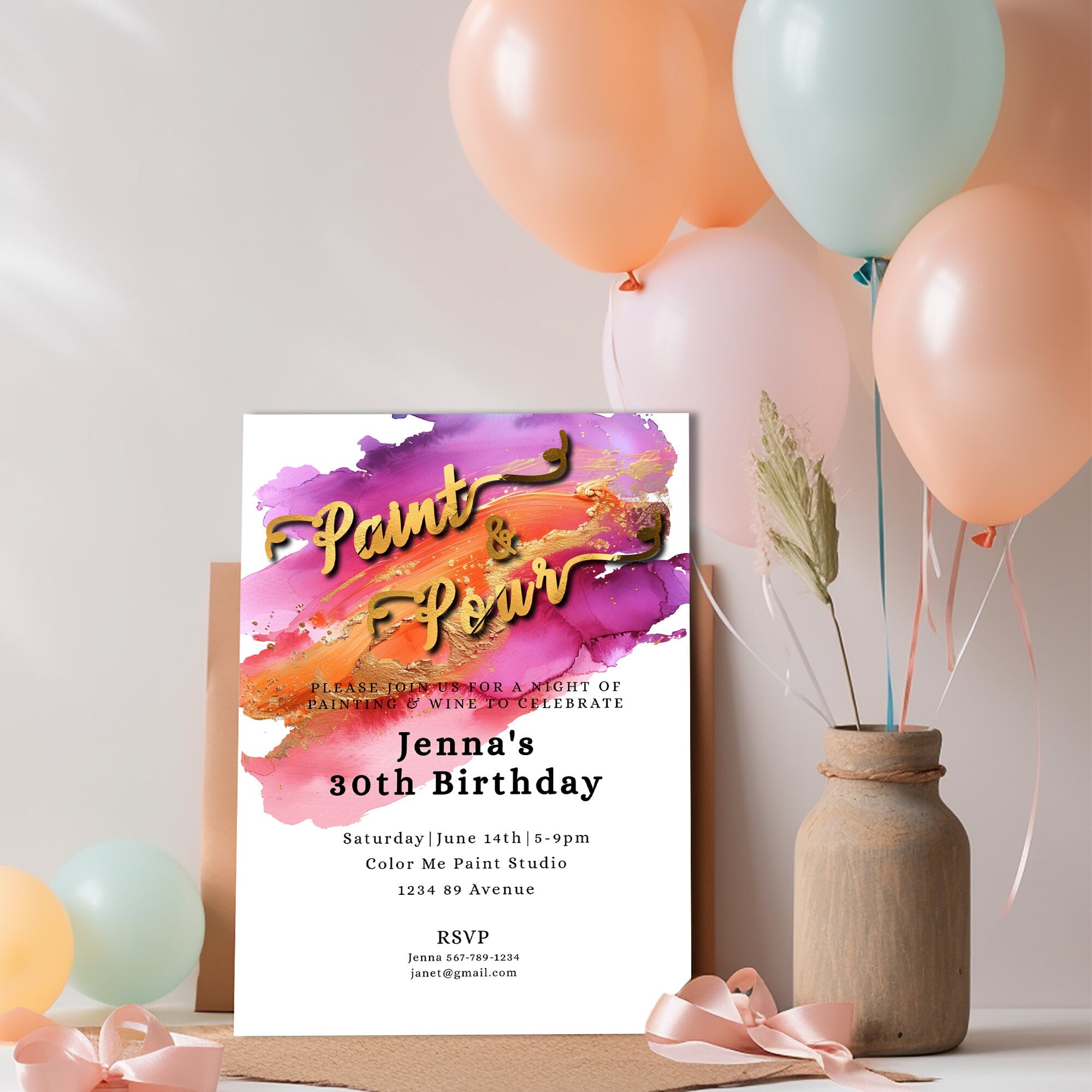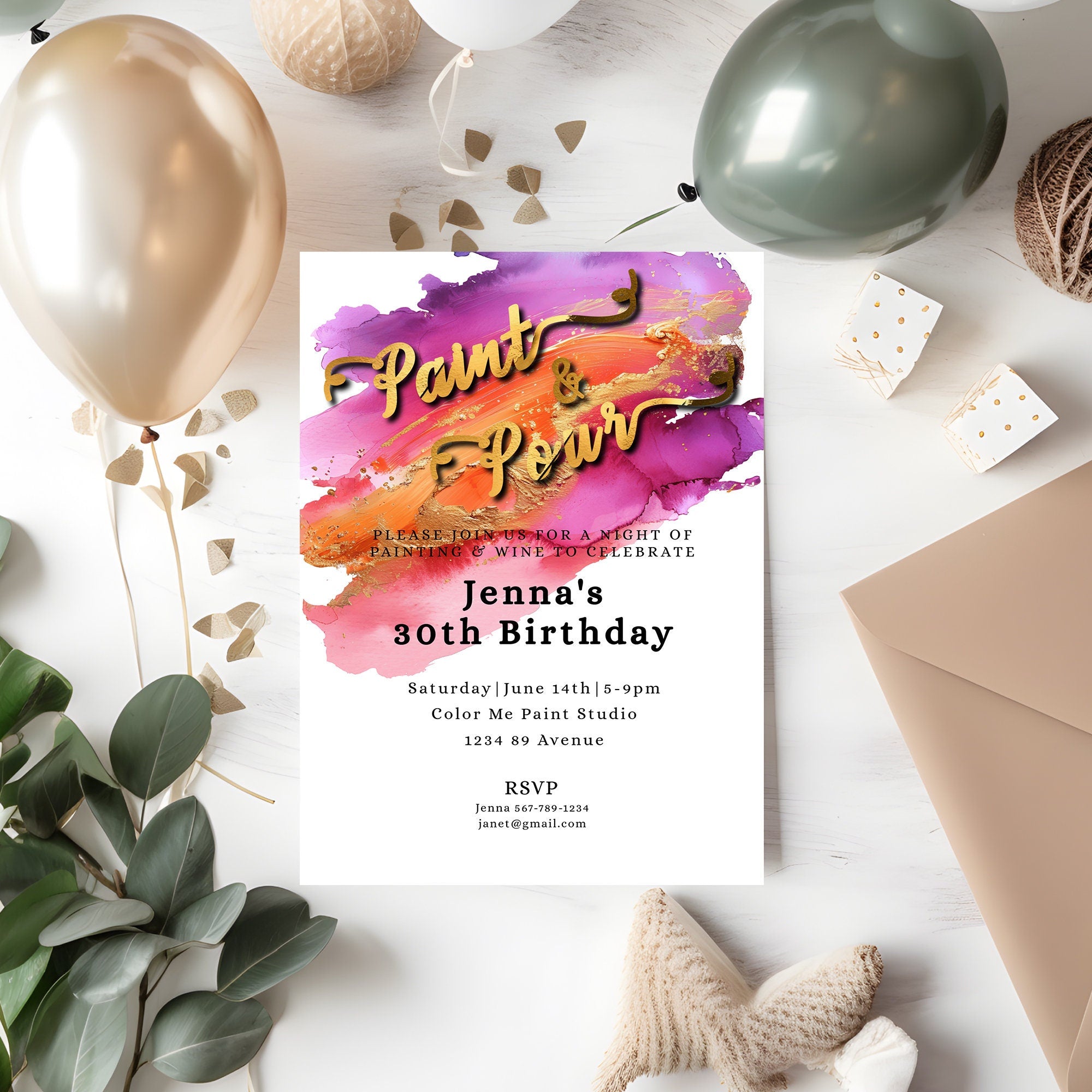 Bring creativity to your celebration with this Paint & Pour Birthday Invitation Template! 🎨 Perfect for art parties, paint nights, and sip & paint events, this 5x7 design features elegant gold foil-style lettering that makes your invite stand out.