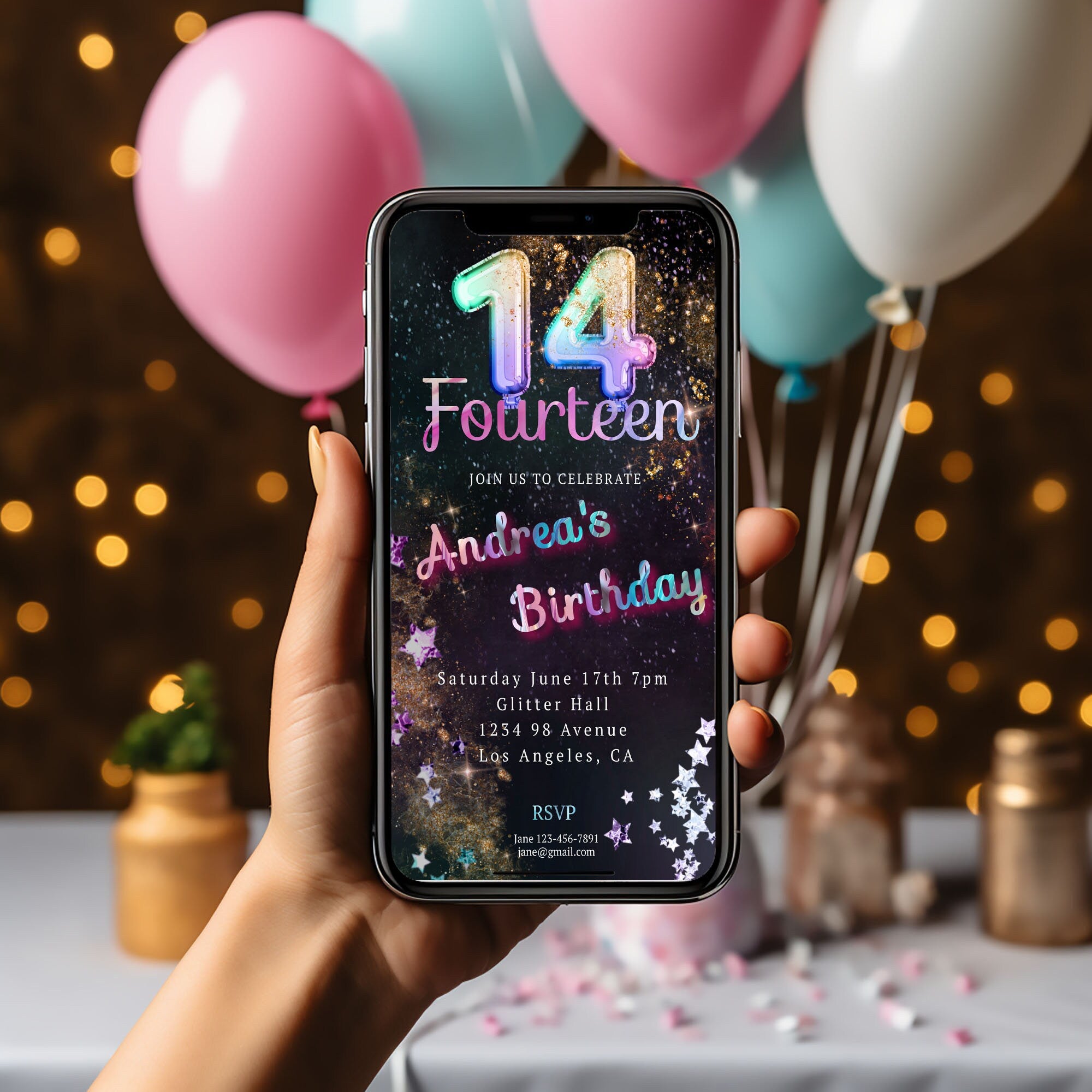 Rainbow Foil 14th Birthday Invitation: Editable Teen Evite (Thank You Tag)