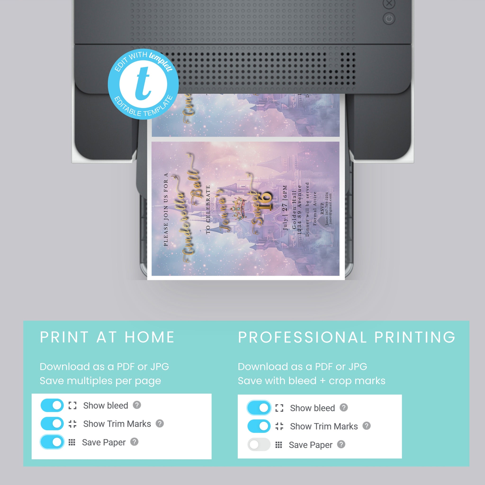 Make your Sweet 16 Extra Special with this Cinderella Ball Princess Invite Template. Our fully editable design features a fairytale castle background and Gold foil lettering, creating a stylish and memorable Invite for your event. You'll receive an 5X7in invite template that is fully editable in your browser and then download and send digitally or Print off at home or send to a printer.