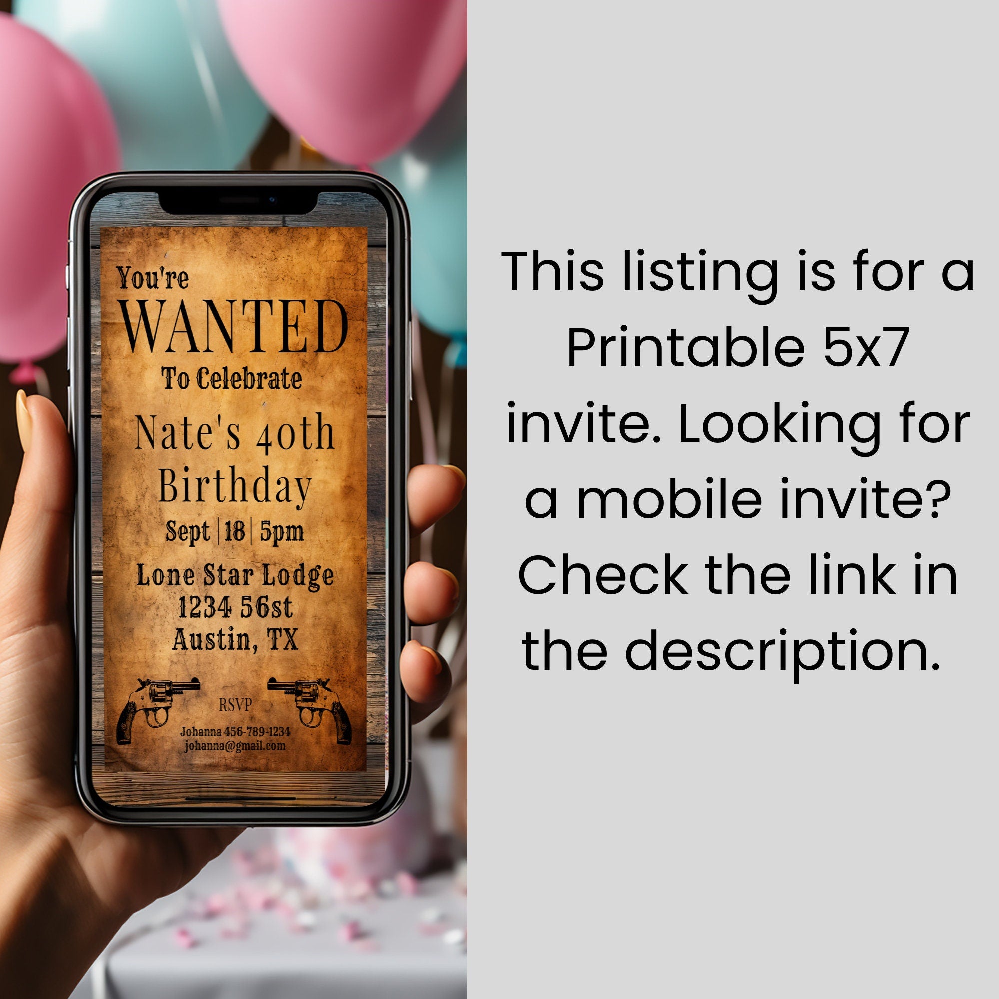 Step into a world of Wild West adventure with this fun, themed invitation set from ThornBloom Studio! This digital bundle combines rustic charm with modern customization, featuring a unique Wanted Poster design perfect for a 40th birthday or any cowboy-themed milestone celebration. It's the ultimate way to set a playful, memorable tone for your event.